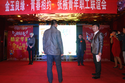 2015年1月10,由我院团委、甘肃煤田地质局145队团委、百合网张掖服务中心共同策划举办的 “金玉良缘——张掖企事业单位单身青年职工联谊会”在张掖市华辰大酒店举行。本次活动吸引了来自全市不同行业的90多名青年职工报名参加。我院有33位单身青年职工参加了这次联谊会。副院长张志诚、院长助理高亚龙出席活动。团委书记李霖带队参加了此次活动。 联谊会精心准备了许多参与性很强的互动游戏,参与活动的青年职工分别进行了“缘分对对碰”、“心有灵犀”、“电影桥段猜猜猜”等一系列互动游戏。在主持人的精心策划下,互不相识的青年男女积极配合,不少青年男女大方展示个人才艺,大胆地向对方表达了自己的好感。特别是在缘分对对碰这个互动环节中,青年男女在轻松愉快的氛围中相互认识、增进了解、交流情感,男生们对自己想要交往的女生说出了自己内心的真实感受,现场气氛热烈融洽,展现了青年人特有的朝气和活力,成为了一次友谊的聚会、一次浪漫的相会。在两个多小时的活动中,我院单身青年积极参与其中,很好地展示了个人才艺,给参加活动的男女嘉宾留下了深刻的印象,赢得了嘉宾们的青睐。 活动最后,单身青年在精心设计的许愿墙上面留下了他们对爱情的期许以及美好祝愿。还相互写下心仪对象的活动号码牌编号,工作人员将根据填写的号牌,在征得本人同意的基础上提供其基本信息和联系方式。三家单位团委还共同建立了QQ群,在加强单位间彼此沟通信息,继续给青年职工创造机会的同时,也为他们自由交流、交友搭建了一个良好的平台。 近年来,随着我院青年职工队伍不断扩大,院党委一直很关注青年职工的婚恋问题,并把解决单身职工的婚恋问题作为稳定职工队伍、推动单位持续发展的一项重要工作来抓。 通过本次单身联谊会,为青年职工们提供了一个展示自我、收获友谊的交友平台,拉近了单身青年职工交往的距离,促进了我院青年职工为实现自己未来完美的人生树立了健康的心态,提高广大青年职工的凝聚力,激发了青年职工干事创业和实现自我价值的热情。