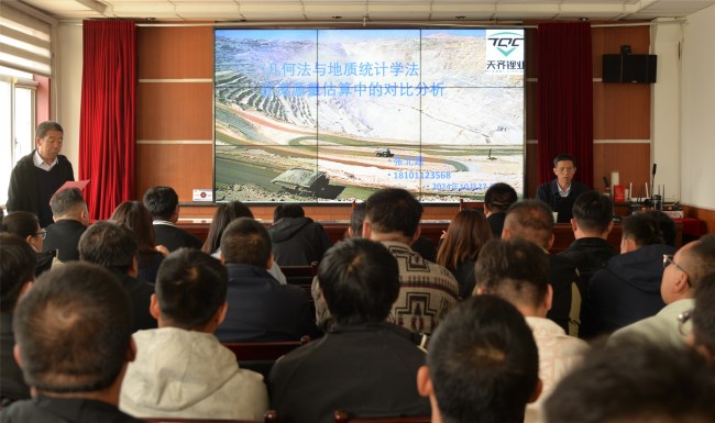 培训中,张教授以“几何法与地质统计学法在资源量估算中的对比分析”为主题,深入浅出的讲授了矿产勘查的工作方法、统计学方法资源量估算及典型矿床案例等内容。在交流讨论环节,就我院小独山报告中存在的一些具体问题,张教授均给予了详细指导。