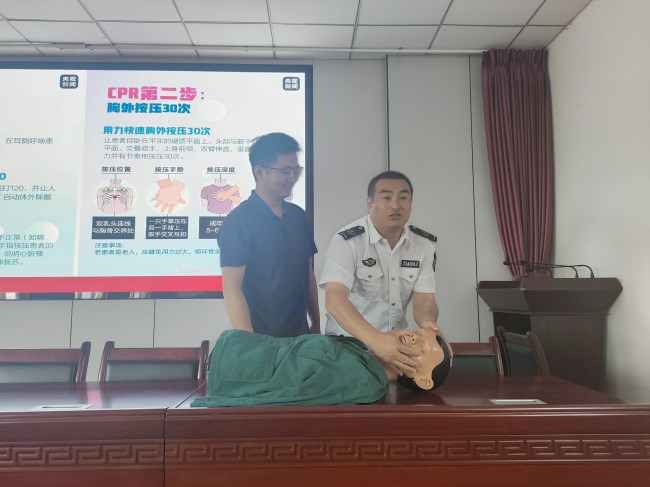 本次培训邀请中消安高级宣教员靳锦州教官现场授课。靳教官结合我们身边触目惊心的真实案例,深入浅出地讲解了消防工作的重要性、预防火灾的基本常识、办公场所及高层建筑的火灾特点及预防方法,应急救援、火场逃生、自救、防震、避震、以及如何正确使用灭火器、灭火毯等消防知识。在应急处置救援方面,靳教官采用“理论讲解+现场实践”的方式,重点向大家详细讲解了心肺复苏法和海姆立克法的原理、要点和手法。靳教官用人体模型现场开展心肺复苏实操演练,并引导参培人员互动上台动手实践,力求让每位参培人员掌握正确的救护方法和技巧,教会大家如何抓住黄金急救时间抢救生命。